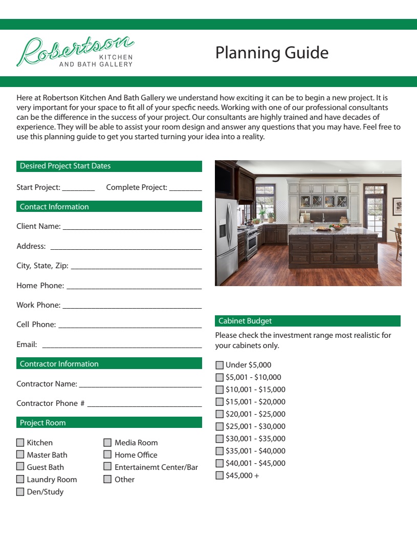 Here at Robertson Kitchen And Bath Gallery we understand how exciting it can be to begin a new project. Feel free to use this planning guide to get you started turning your idea into a reality.